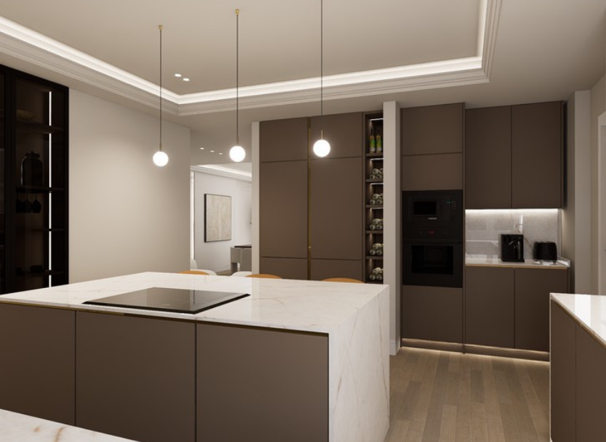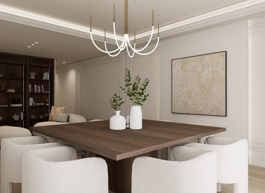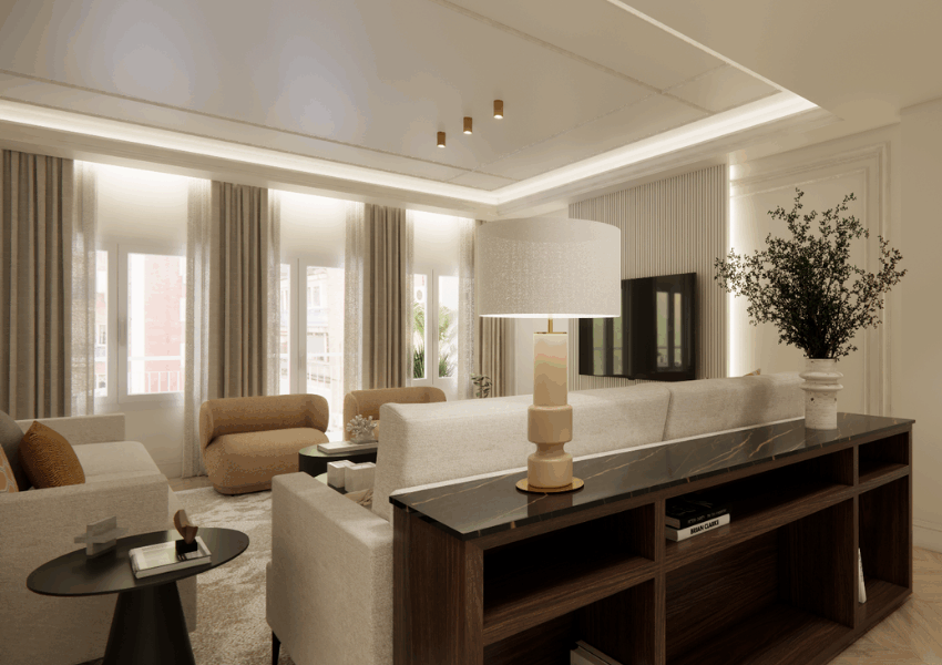 Bespoke lighting and minimalist luxury décor reflecting Madrid’s refined character