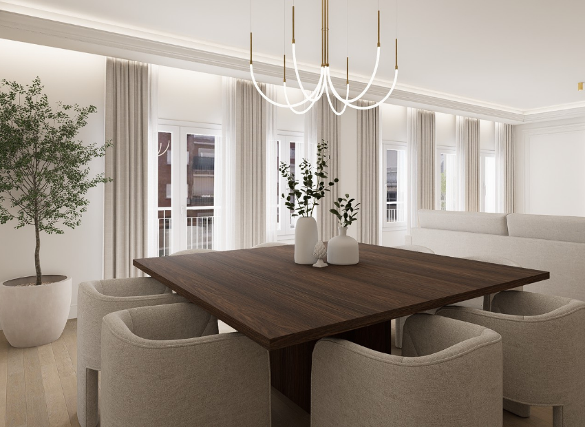 Spanning 293 square meters, this third-floor apartment has been fully renovated to combine classical Madrid architecture with contemporary design, craftsmanship, and functionality.