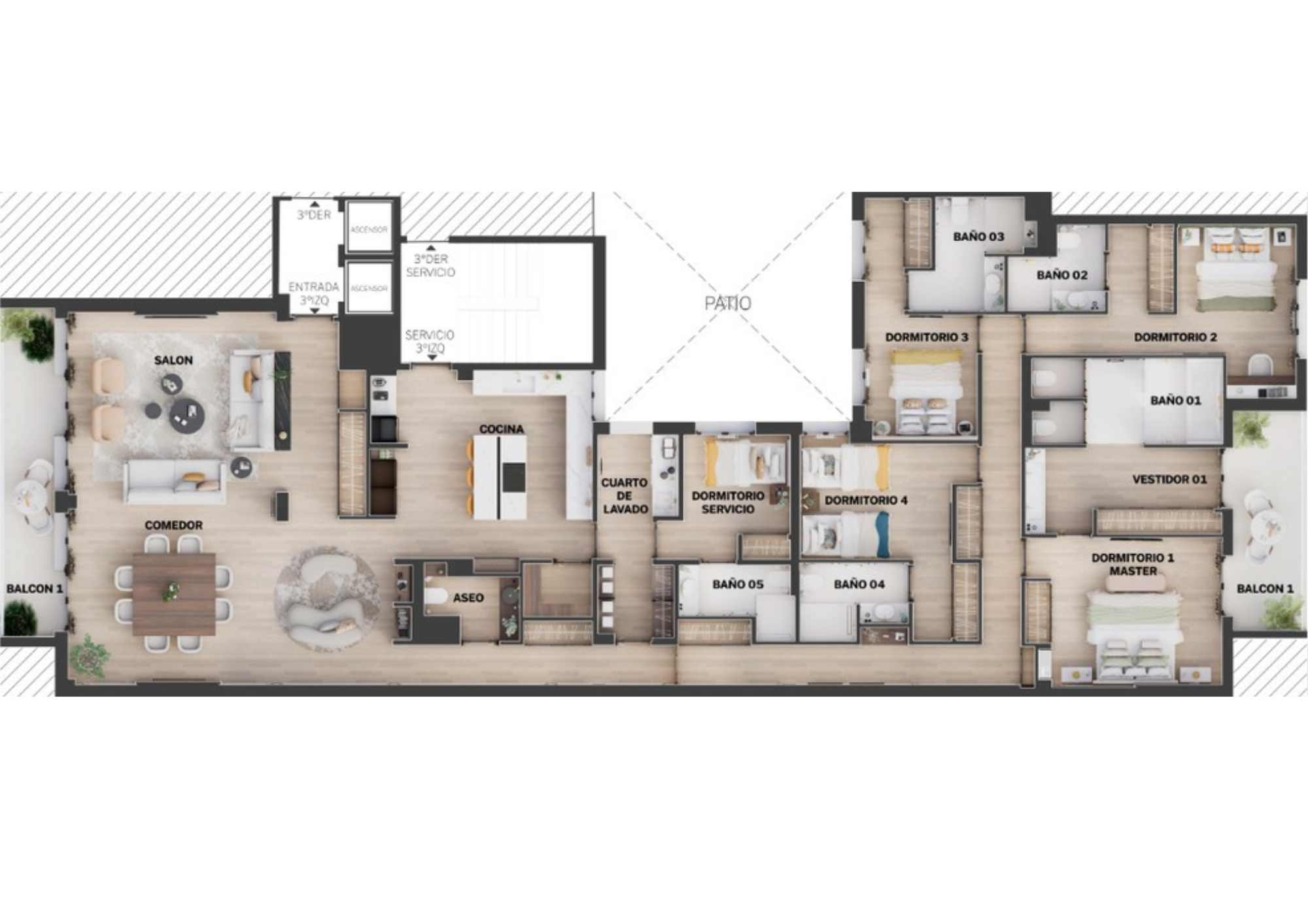 - Configuration: 5-bedroom luxury apartment with terrace and storage room